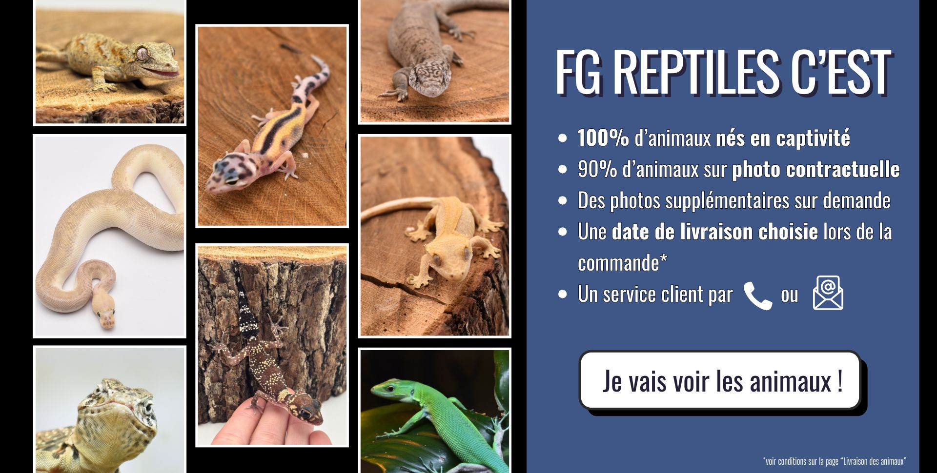 Riche des 2000 naissances que nous obtenons par reproduction chaque année, nous sommes fiers de vous proposer des animaux issus, pour la plus grande majorité, de nos élevages. Le reste provient d'éleveurs partenaires sélectionnés avec rigueur dans le cadre de collaborations. Tous les animaux présents sur notre site de vente en ligne de reptiles sont donc élevés avec passion, dans le respect de l'animal et de son bien-être. Chez FG Reptiles, vous pourrez ainsi trouver une grande variété de reptiles. Vous pourrez acheter des lézards (agame barbu appelé aussi pogona, différents geckos comme le léopard ou le gecko à crête) mais aussi acheter des serpents (pythons, couleuvres et boas) et acheter des invertébrés (araignées, escargots, iules, isopodes, insectes comme blattes, mantes et phasmes).